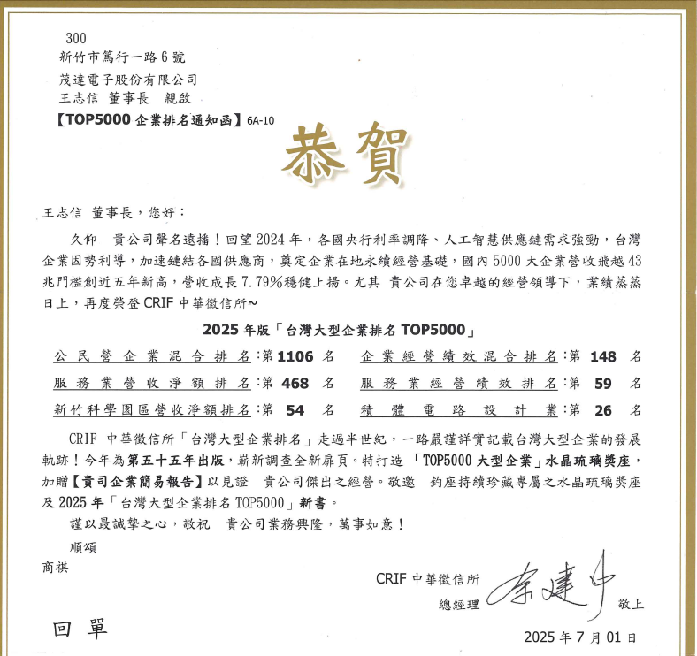 Ranked 26th in the IC design industry among the 2024 Top 5000 Large Enterprises in Taiwan by China Credit Information Service Ltd.