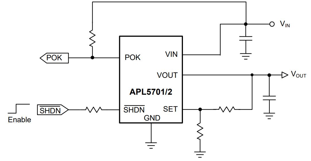 The APL5701/2 is a P-channel low dropout linear regulator which needs only one input voltage from 1.42V to 3.47V, and delivers current up to 700mA to set output voltage. It also can work with low ESR ceramic capacitors and is ideal for using in the battery-powered applications such as notebook computers and cellular phones. Typical dropout voltage is only 75mV at 700mA loading. The APL5701/2 integrates many functions. A POK indicates that the output voltage status with a delay time set internally. It can control other converter for power sequence. TheAPL5701/2 can be enabled by other power systems. Pulling and holding the EN voltage below 0.4V shuts off the output. The functions of thermal shutdown and current-limit protect the device against thermal and current over-loads. The APL5701/2 is available in a SOT-23-5, SOT-23-6, SOP-8P, TDFN3x3-10 and TDFN2x2-8 packages.