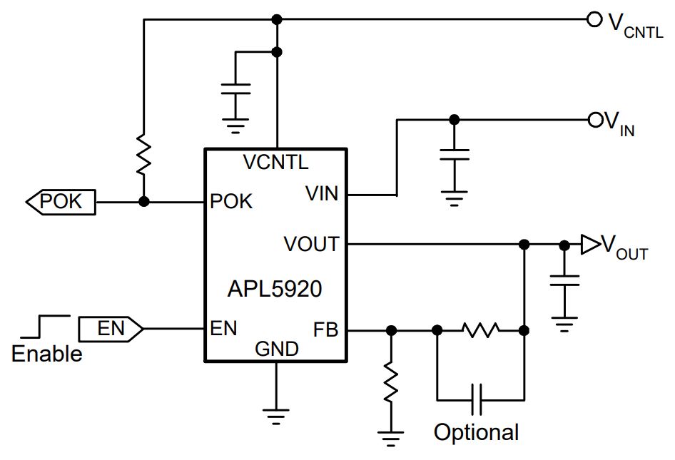 The APL5620 is a 2A ultra low dropout linear regulator. The IC needs two supply voltages, one is a control voltage (VCNTL) for the control circuitry, the other is a main supply Voltage (VIN) for power conversion, to reduce power dissipation and provide extremely low dropout voltage. The APL5620 integrates many functions. A Power-On-Reset (POR) circuit monitors both supply voltages on VCNTL and VIN pins to prevent erroneous operations. The functions of thermal shutdown and current-limit protect the device against thermal and current over-loads. A POK indicates that the output voltage status with a delay time set internally. It can control other converter for power sequence. The APL5620 can be enabled by other power systems. Pulling and holding the EN voltage below 0.4V shuts off the output. The APL5620 is available in a TDFN3x3-10 package which features small size as TDFN3x3-10 and an Exposed Pad to reduce the junction-to-case resistance to extend power range of applications.