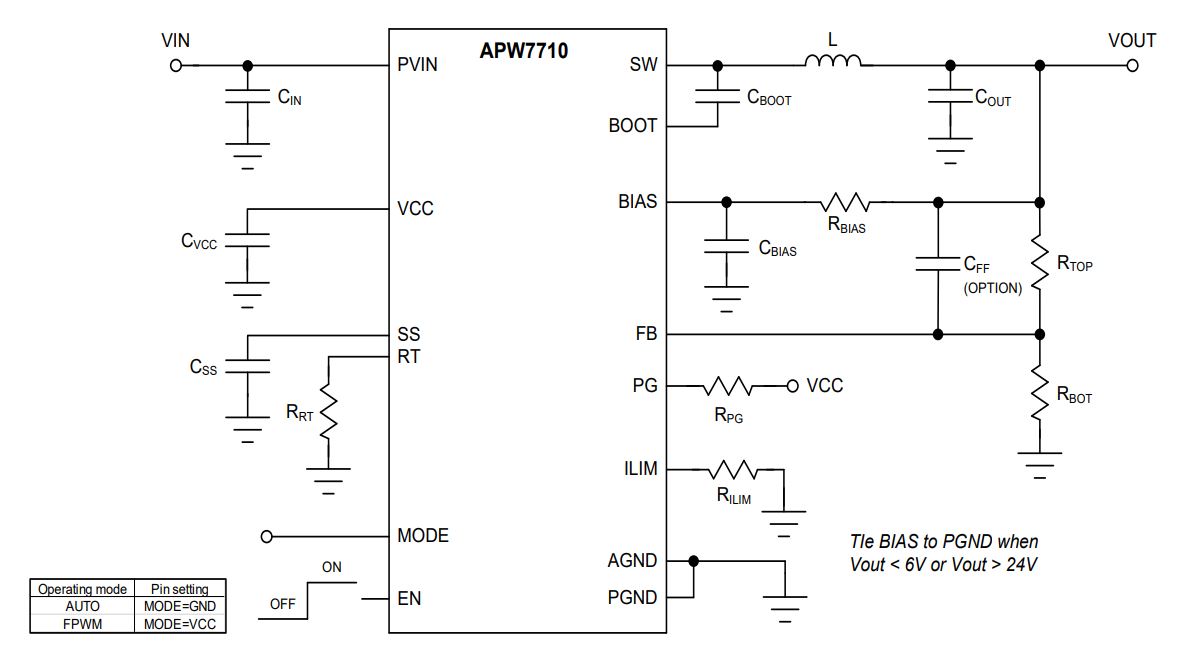 The APW7710 is a wide input voltage range synchronous step-down DC-DC converter that can deliver up to 5A output current with a 5V to 60V input supply. The exceptional efficiency and output accuracy provided in a smaller solution size make APW7710 easier to use. The APW7710 uses a peak current mode control scheme to regulate the output voltage. Auto mode selection is provided to improve the efficiency when the device operates in light load. BIAS bypass pin allows for connecting VOUT to power the internal control circuitry under the output voltage range of 6V~24V application, thereby reducing overall system power consumption for better efficiency. Under-voltage protection with hiccup mode provides cycle-by-cycle current limit protection against shorted output and soft-start eliminates inrush current during start-up. Adjustable switching frequency, soft start, current limit, FPWM option provide flexible application. Additional features such as input under-voltage lock-out, output over-voltage protection, over-temperature protection offer completely safe and smooth operation in applied conditions.