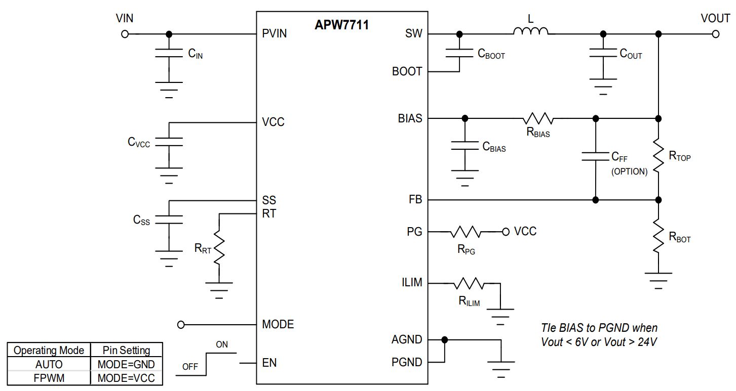 The APW7711 is a wide input voltage range synchronous step-down DC-DC converter that can deliver up to 3.5A output current with a 5V to 60V input supply. The exceptional efficiency and output accuracy provided in a smaller solution size make APW7711 easier to use. The APW7711 uses a peak current mode control scheme to regulate the output voltage. Auto mode selection is provided to improve the efficiency when the device operates in light load. BIAS bypass pin allows for connecting VOUT to power the internal control circuitry under the output voltage range of 6V~24V application, thereby reducing overall system power consumption for better efficiency. Under-voltage protection with hiccup mode provides cycle-by-cycle current limit protection against shorted output and soft-start eliminates inrush current during start-up. Adjustable switching frequency, soft start, current limit, FPWM option provide flexible application. Additional features such as input under-voltage lock-out, output over-voltage protection, over-temperature protection offer completely safe and smooth operation in applied conditions.